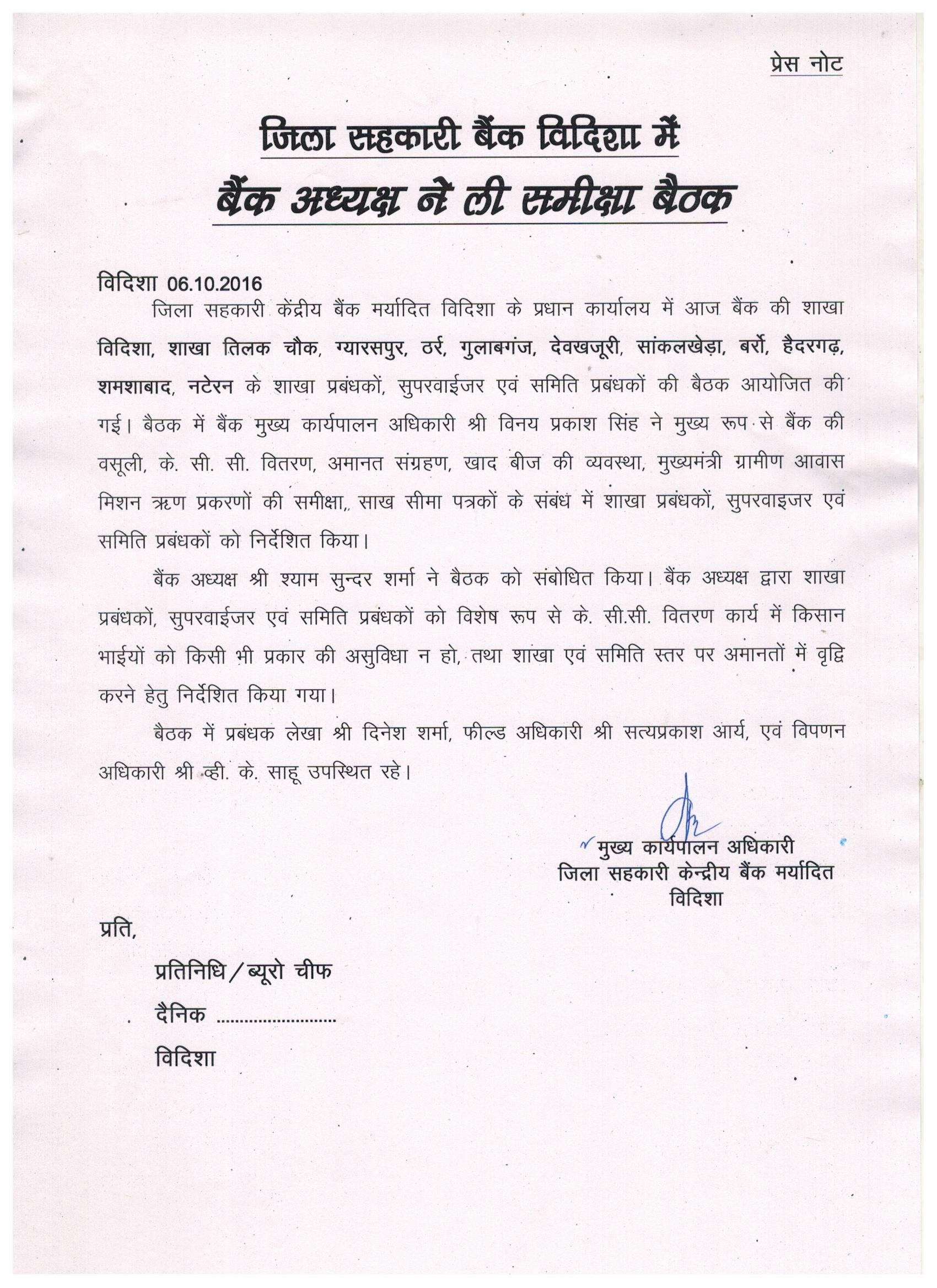 जिला सहकारी बैंक विदिशा मैं बैंक अदà¥à¤¯à¤•à¥à¤· ने ली समीकà¥à¤·à¤¾ बैà¤