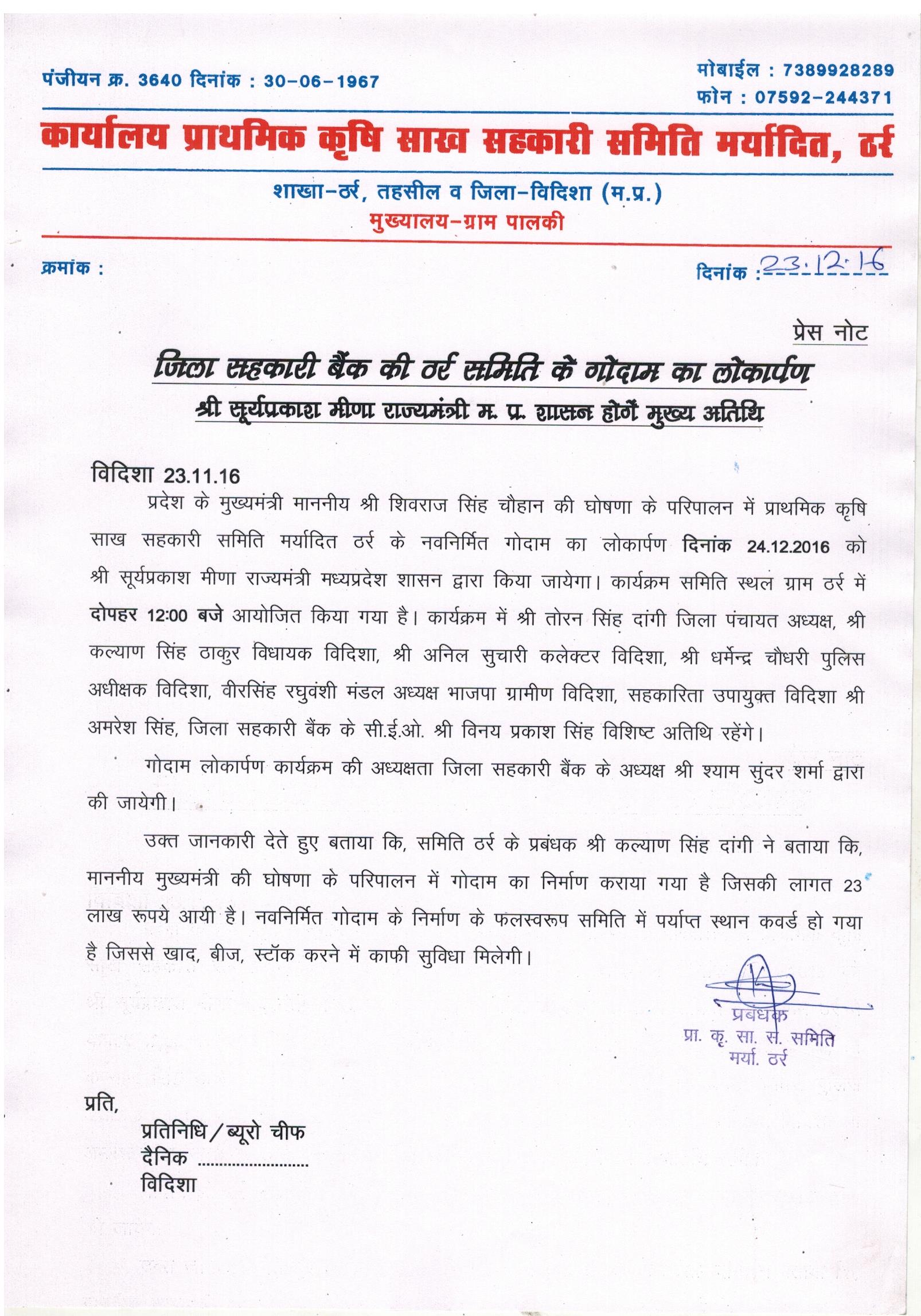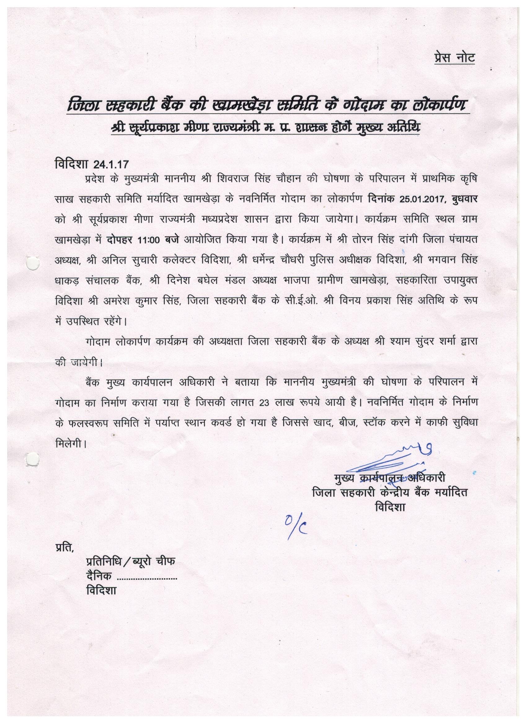 जिला सहकारी बैंक की खामखेड़ा समिति के गोदाम का लोकारà¥à¤ªà¤£